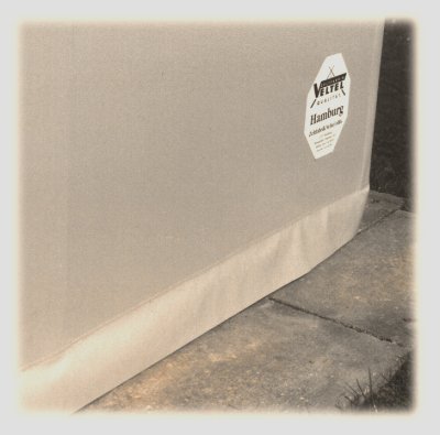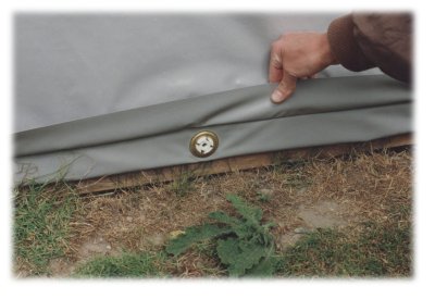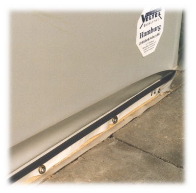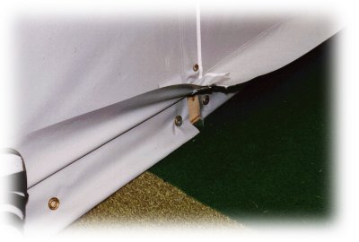 Bodenabspannung bei Rundrohrvorzelten Die Bodenabspannung ist wichtig, damit Ihr Vorzelt auch bei Sturm nicht "abhebt". Wichtigstes Element sind die Veltel-Fußanker, die wir Ihnen bei den Qualitätsmerkmalen vorgestellt haben. Unsere Bodenabspannung besteht aus den Elementen Bodenstreifen (als Standard 50 cm hoch als Spritzschutz), dem innenliegenden Erdstreifen (zur Abdichtung unter den Teppich gelegt) und der Befestigung am Fußboden oder im Erdboden. Zur Befestigung bieten wir Ihnen vier Varianten an: 1. verdeckt genähte Haken für auswechselbare Gummiringe 2. verdeckt genähter Saum mit Ösen